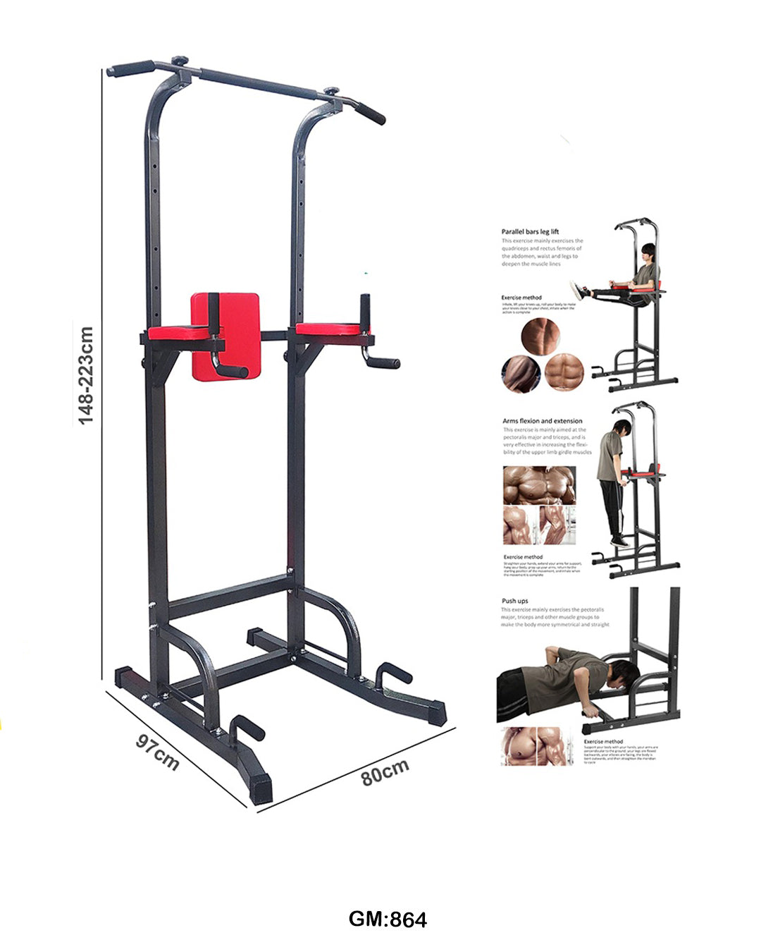 The Multi-Functional Adjustable Dipping Station and Pull-up Bar Workout Rack "864" offers a versatile solution for strength training. Its adjustable design accommodates various exercises including dips, pull-ups, and leg raises, allowing targeted muscle development. Built for stability and durability, this rack supports intense workouts while adapting to your height and fitness needs. Ideal for both home gyms and professional settings, it enhances upper body strength through effective functional training.
