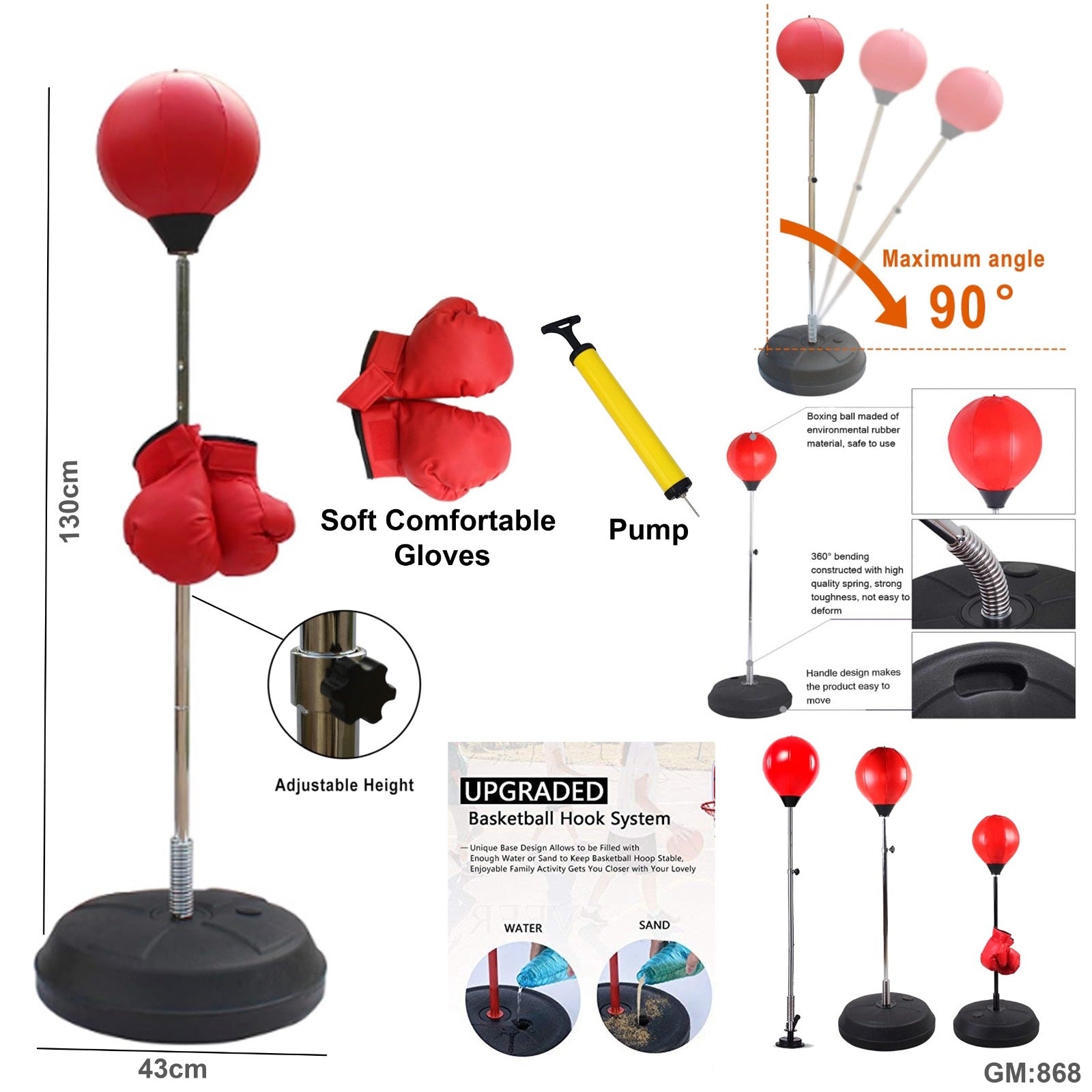 Designed for both adults and kids, the Punching Bag "868" comes complete with boxing gloves, offering a comprehensive training set that promotes fitness, coordination, and stress relief. Its durable construction ensures long-lasting use for various skill levels, making it ideal for developing punching technique and building strength safely at home or in the gym. This set supports effective boxing practice with comfortable gloves that protect hands and wrists during workouts.